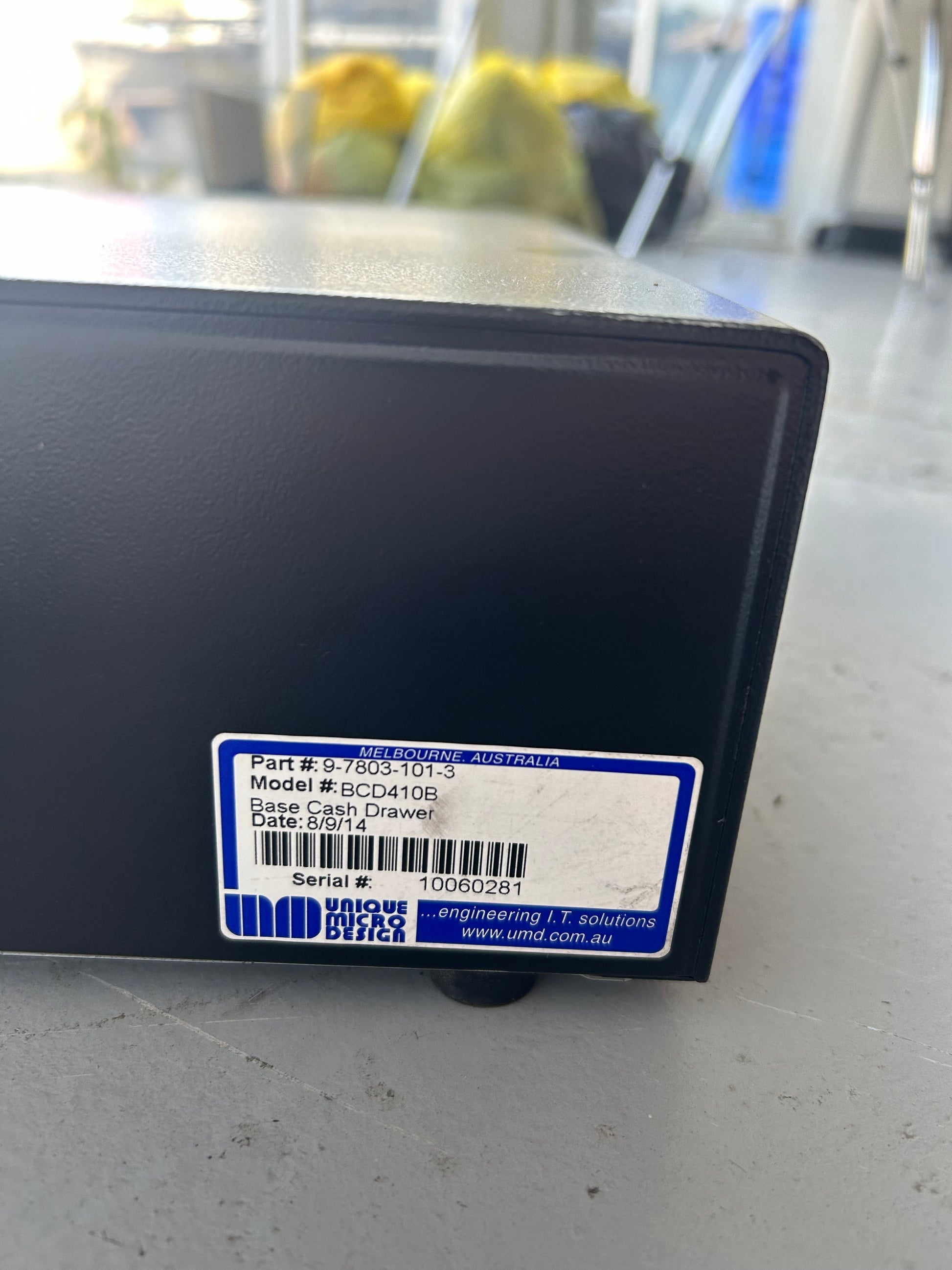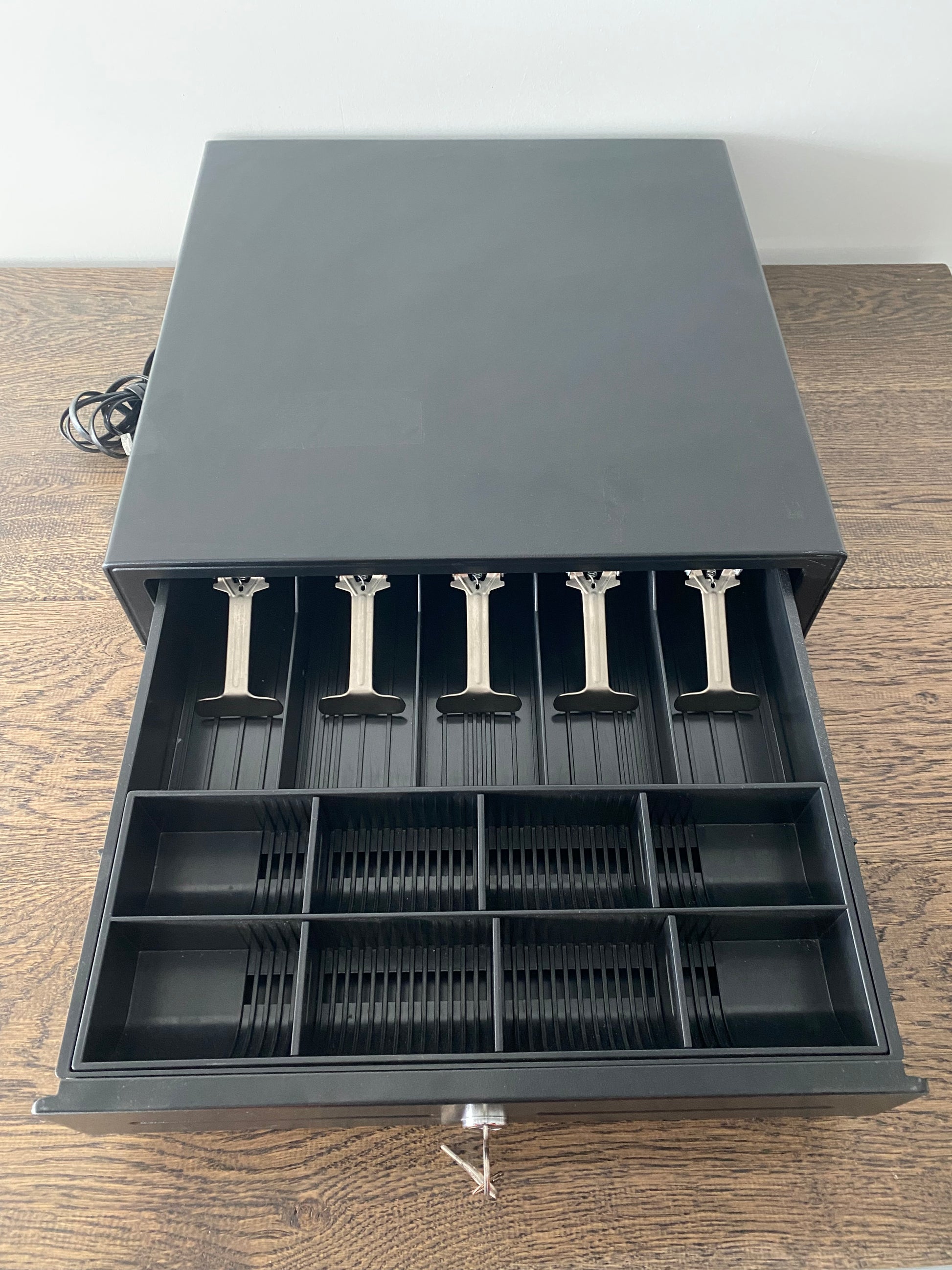 Cash register drawer with cable connection.